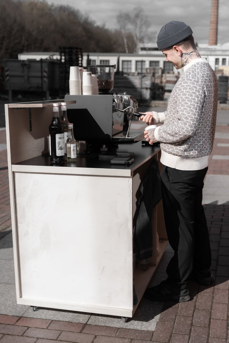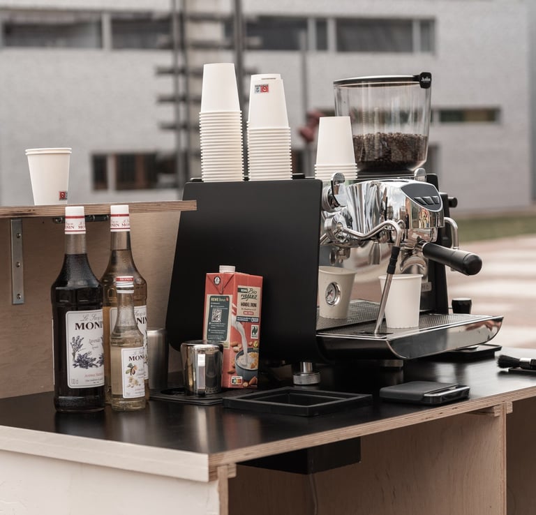 Veredelt eure Veranstaltung mit einer komplett ausgestatteten Espresso Bar, lokal geröstetem Kaffee und klassischen Flavours wie Vanille, Lavendel und Weiße Schokolade. Genießt zusätzlich eine Premium-Sorte Kaffee (fruchtiger) sowie koffeinfreie Highlights wie Matcha oder Tee. Die perfekte Wahl für alle, die Abwechslung und ein gehobenes Erlebnis für ihre Gäste suchen!